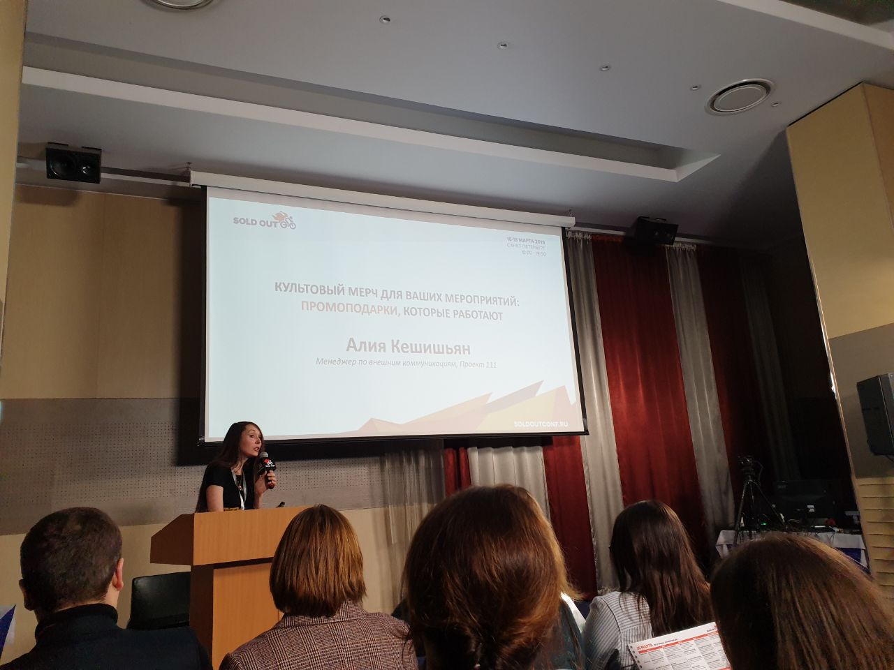 Начинается первая секция докладов. Я выбрала выступление "Культовый мерч для ваших мероприятий: промоподарки, которые работают". Выступает менеджер по внешним коммуникациям компании Проект111 Алия Кешишьян