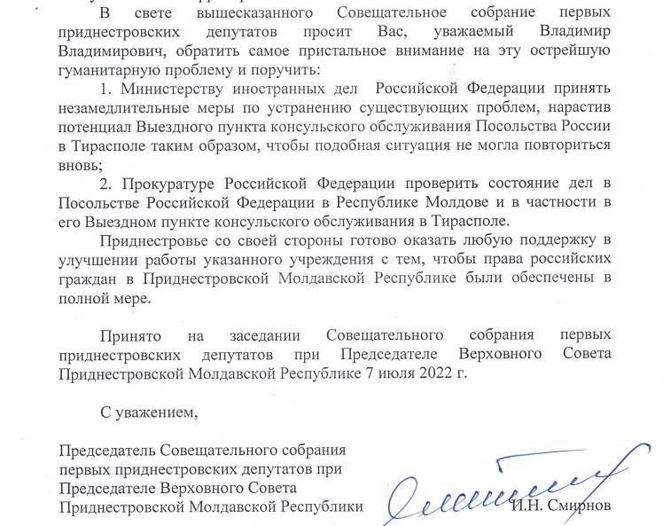 «Просим вас, уважаемый Владимир Владимирович, обратить пристальное внимание на эту острую гуманитарную проблему и поручить МИДу РФ принять меры по устранению проблемы. Приднестровье готово оказать любую поддержку в улучшении работы консульства».