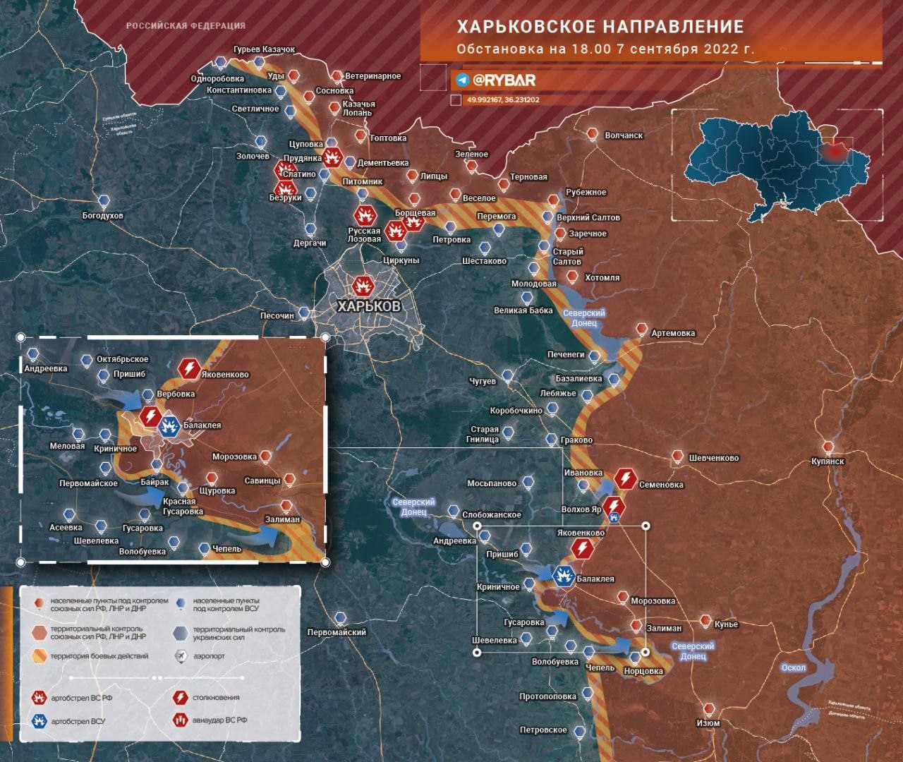 ▪️В бой вступили спешно переброшенные резервы ВС РФ, которые отразили атаки и не дали противнику взять Шевченково. Украинское командование перебрасывает подкрепления и планирует возобновить удары с целью взять контроль над дорожной сетью к северу от Балаклеи и создать плацдарм для наступления на Купянск.