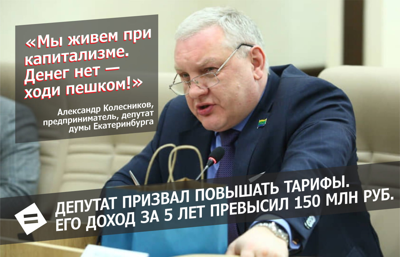🚶♂️«Мы живем при капитализме. Мы почему не поднимаем стоимость [проезда]? Чего боимся? Не нравится, денег нет – не езди, ходи пешком!», – заявил предприниматель и депутат городской думы Екатеринбурга Александр Колесников, призвав повышать тарифы на проезд в общественном транспорте.