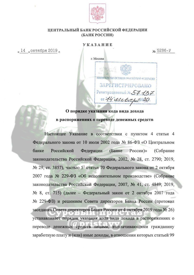 Так вот, наш неутомимый «паучок» сегодня нас поправил: оказывается, Центробанк еще в середине октября прошлого года выпустил соответствующий документ, согласно которому денежным средствам должников, являющимся заработной платой или иными доходами, в отношении которых Законом «Об исполнительном производстве» установлены ограничения размеров удержания, организации, производящие выплаты, обязаны будут указывать в назначении платежа код «1», денежным средств, являющихся доходами, на которые в соответствии с Законом не может быть обращено взыскание — код «2», а денежным средствам, являющихся доходами, к которым в соответствии с Законом ограничения по обращению взыскания не применяются (суммы, выплачиваемые в возмещение вреда, причиненного здоровью, а также компенсационные выплаты гражданам, пострадавшим в результате радиационных или техногенных катастроф — при взыскании долгов за алименты в отношении несовершеннолетних детей, а также по обязательствам о возмещении вреда в связи со смертью кормильца) — код «3».