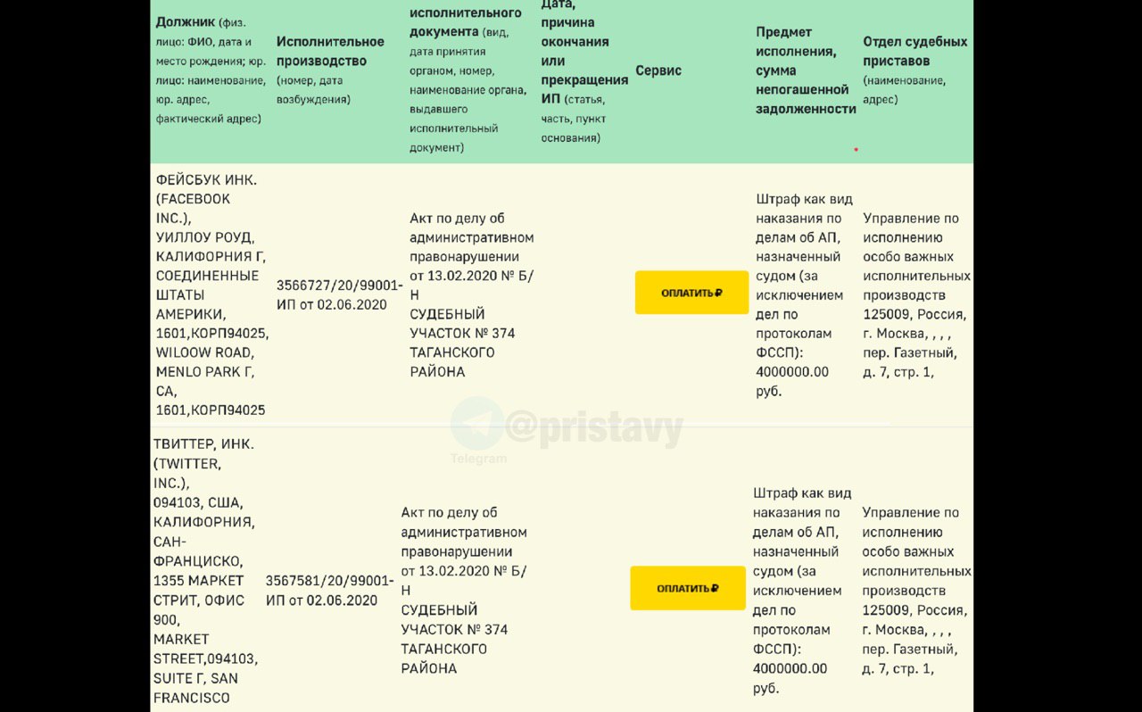 В отношении американских социальных сетей Facebook и Twitter ФССП России возбудила исполнительные производства о взыскании административных штрафов в размере 4 млн. с каждого должника на основании постановлений мирового судьи.