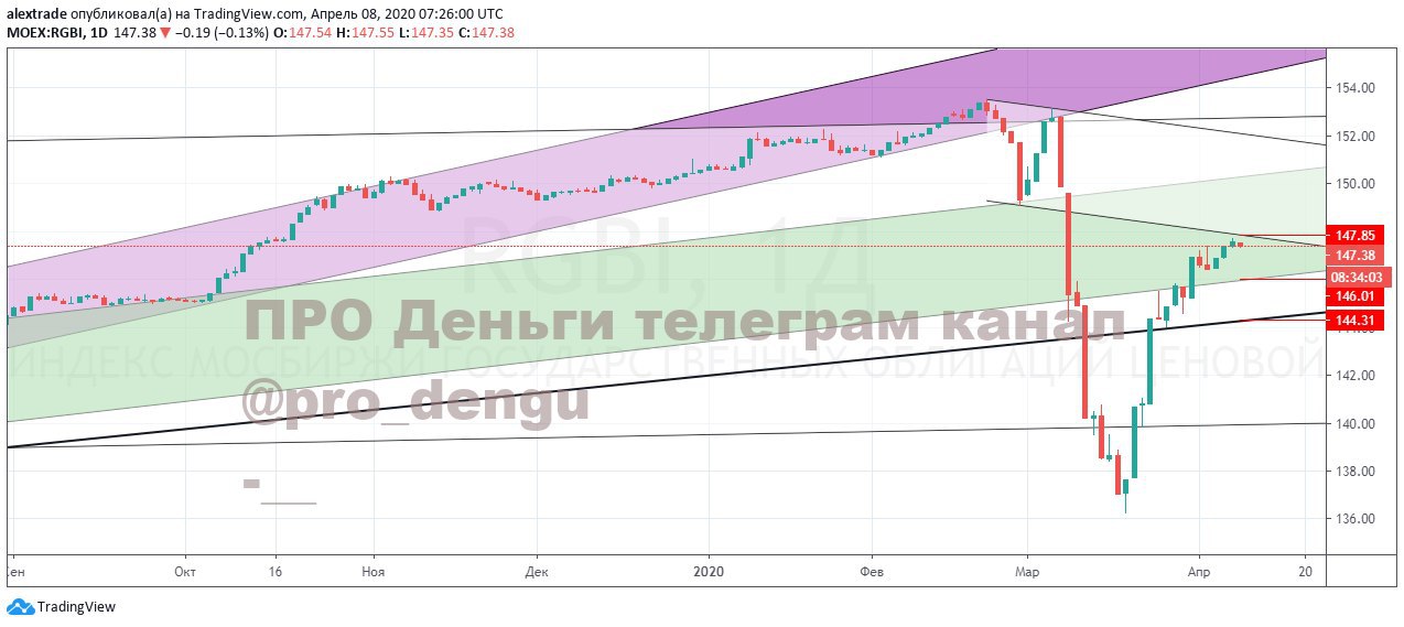 🇷🇺Индекс гос. облигаций РГБИ (ОФЗ), 147,38 в моменте, консолидируется под н.гр. даунканала 147,85 и двумя н.гр. апканалов 146,01 и 144,31. Сегодня первое испытание для ОФЗ. Минфин РФ заявил о проведение 3-х аукционов ОФЗ, первых после обвала рынка в марте 2020 г. Посмотрим на реакцию вторичного рынка ОФЗ.