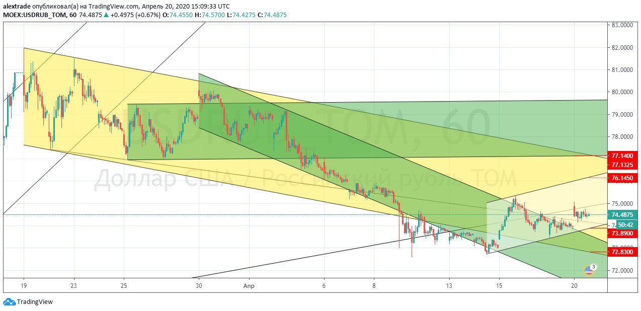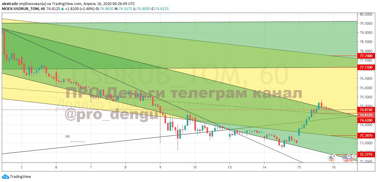 🇷🇺🇺🇸Доллар рубль часовик, сделали тест снизу 74,7-75,25 (тест снизу 74,8 на дневках) пост от вчера https://news.1rj.ru/str/pro_dengu/1782. Программа минимума отскока выполнена.Теперь неизвестность, прямо на в.гр. зеленого даунканала стоим. Но я бы не ставил деньги на рост доллара против рубля в текущей ситуации. Считаю, что макс года уже показали. Единственное, но, это возможные изменения в ДКП ЦБ РФ, при текущей денежно-кредитной политике значимый рост доллара маловероятен, но если будет сильно смягчаться ДКП (в это я не верю при текущем руководителе ЦБ РФ) рубль попадает.