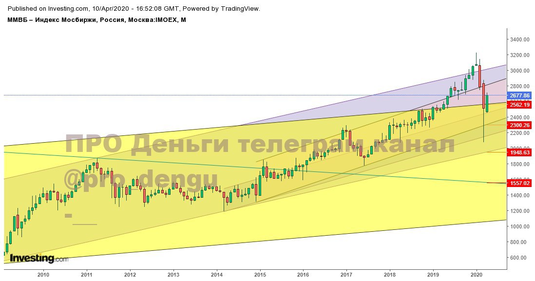 Быстрое снижение февраля и части марта, быстро выкупили от 2073 до текущих 2677, правда часть отскока быкам придется скорей всего отдать обратно до 2560 и может быть и до 2300, мы продолжим сильно коррелировать с SP500. Быкам главное не сдавать 1948. Техническая картина весьма позитивная для дальнейшего роста индекса в долгосрочном периоде. Не забываем про сильно растущий баланс ФРС, это положительно повлияет на стоимость реальных активов в долгосроке в том числе и сырья. @pro_dengu