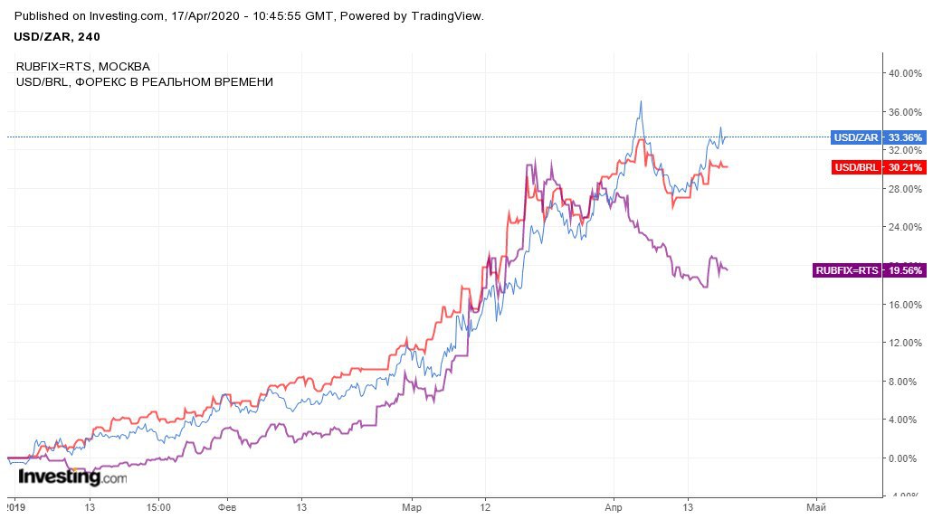 🇷🇺🇿🇦🇧🇷Сравнение девальвации 3-х валют стран БРИКС рубля, рэнда ЮАР, бразильского реала с начала 2020 г. Рубль ослабление рубля на 19,56%, бразильский реал 30,21%, рэнд ЮАР 33,36%. Динамика примерно совпадала с начала года до 30 марта 2020 года, затем рубль стал сильно крепче своих аналогов.
