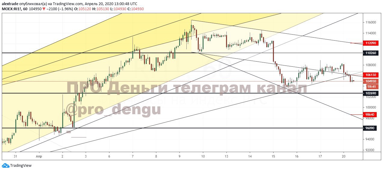 🇷🇺Фьючерс на индекс РТС (РИ) часовик, Ри вчера прилично упал, пробил 106 500 дошел до 103 570 н. гр более пологого апканала (в моменте прокалывал сегодня с утра, но закрытие первого часа выше). Сегодня делаем тест снизу 107 440 н. гр. но уже даунканала (нулевой локальный канал текущего движения вниз).