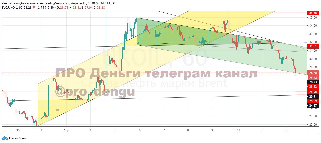 Нефть брент часовик, выполнили уже программу минимум по снижению пришли в зону 28,2 (бывшая 29,3), остается 25,59-26. Снизились на нижнию границу даунканала, где часть шорта надо откупать. @pro_dengu #нефть