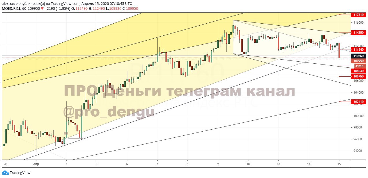 🇷🇺Фьючерс на индекс РТС (РИ) часовик, 112 670 в моменте продолжаем отскок с низов. Рублевый индекс Московской Биржи вчера покинул локальный растущий канал (но без ретеста снизу пока). Часть отскока с низов от 19 марта будем сдавать обратно - это как минимум. Придет время и на валютном Ри то же самое случится, пока этого нет.