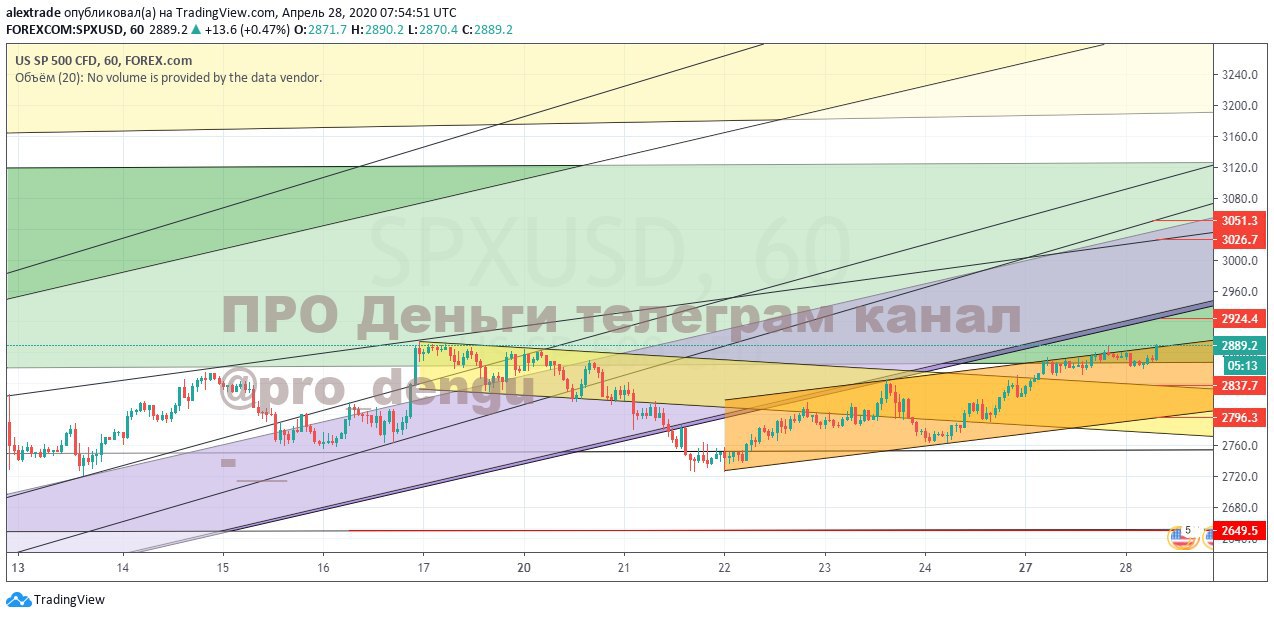 🇺🇸Фьючерс SP500 часовик, сдается 2880, еще возможен отбой вниз на 2840 и 2800, но надо смотреть уже вверх 2925 (тест снизу фиолетового апканала) и далее 3026 3051 и 3100. Не зря закрыл я шорт на прошлой неделе, желтый даунканал сломали окончательно. Быки доминируют, свежая ликвидность ФРС, начало снятия ограничений по коронавирусу в самих США (некоторые штаты пока) делает свое дело.