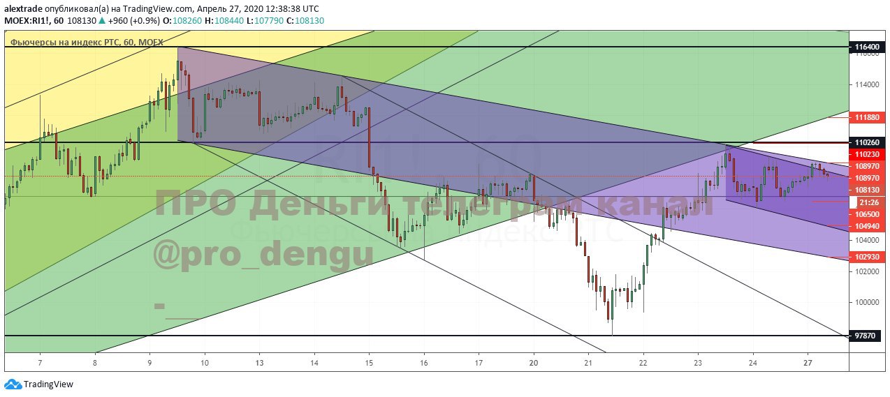 🇷🇺Фьючерс на индекс РТС (РИ) часовой таймфрейм, с момента крайнего обзора, что изменилось? Локальное движение наверх с началом от 21 апреля завершилось на 110 130 (точно на в. гр. фиолетового даунканала), от которой пошел отбой вниз к 106 500. Пока стоит локальный даунканал, коррекция вниз может продолжиться и усложниться. Мы под, а не над 110 260. Кроме того, на прошлом заходе вниз цель 96 000+ не выполнили.