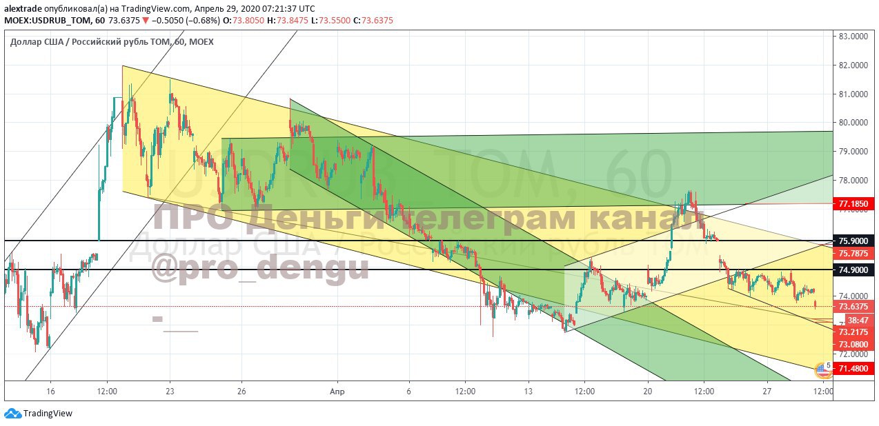 Рисуется локальный растущий канал, но опять же все движение под 74,9 а не над уровнем. При удачном пробое 74,9 и ретесте сверху коррекционное движение вверх может продолжиться до 76,14. 73,89 основная поддержка для быков. Не однозначный момент на доллар рубле. Без позиции по активу. @pro_dengu #рубль