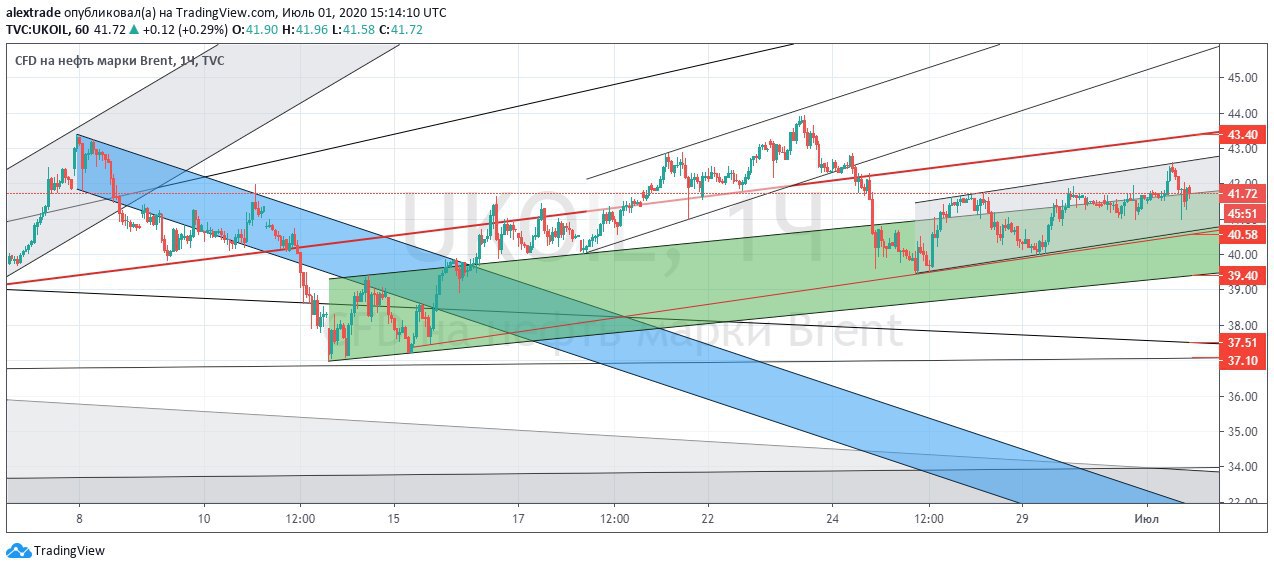 🛢Нефть брент часовой таймфрейм, вышли запасы от Минэнерго США. Запасы сырой нефти: снижение -7,195M, прогноз был снижение -0,710M, статистика недельная вышла бычья, но нефть немного снизилась. Но кардинально ничего не изменилось. Локальный боковик пока продолжается, пока стоит зеленый апканал шансы на добой до 45+ есть. Только с потерей н. границы 39,40 в моменте, наконец начнется глубокая коррекция и преобладание медведей. Осторожно 03 июля в пятницу в США нерабочий день, праздник День независимости (04 июля суббота), завтра короткий день на биржах. @pro_dengu #нефть
