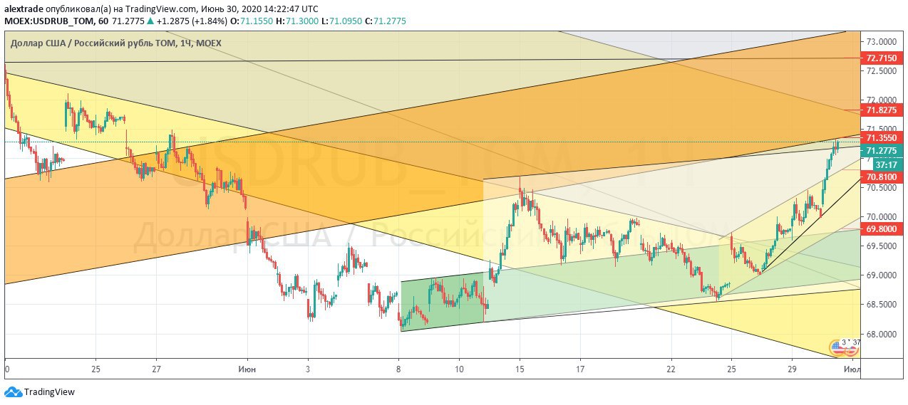 🇷🇺🇺🇸Доллар рубль часовой таймфрейм, 71,27 (+1,84%) в моменте, потрогали снизу сегодня уже 71,32 это н. граница апканала от января 2020 года, который был пробит вниз 01 июня (это тест снизу, пока сдерживает движение вверх), почему бы его не пробить в первый рабочий день июля, его пробой уже грозит 71,82 и 72,71. Рубль доллар конечно коряво идет наверх, я уже давно привык к этому. Цели внизу я указал при возможно отбиве вниз от 71,3+(70,81, 70,45). Просто лучше не трогать лонги доллара, цели те же, ничего не изменилось. @pro_dengu #рубль