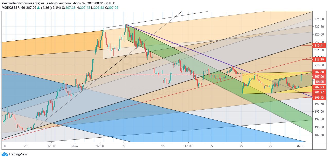🇷🇺Акции Сбербанка часовик, надо отдать должное быкам в сбере, смогли они перевести вялое снижение в боковик 207 в моменте, фиолетовая сигналка сверху пробита 30 июня с ретестом и ретест четкий (до этого был сдан нулевой зеленый даунканал). Сейчас торгуемся в желтом канале (фактически без наклона), преимущества медведей в краткосроке уже нет, в среднесроке есть.