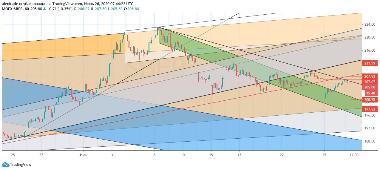 Акции Сбербанка, вчера акции Сбербанка обновили локальный минимум (теперь он 200,75) и пошли на закрытие гепа на 207+. Сбер стабильно закрывает гепы вниз, снижение замедлилось, так как пробит зеленый даунканал, но мы ниже красной сигналки и н.границы серого апканала 212 примерно, 195+ поднялось до 197,8+, это и есть цель снижения пока.