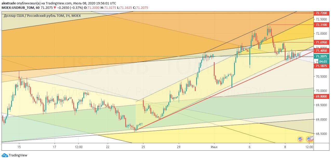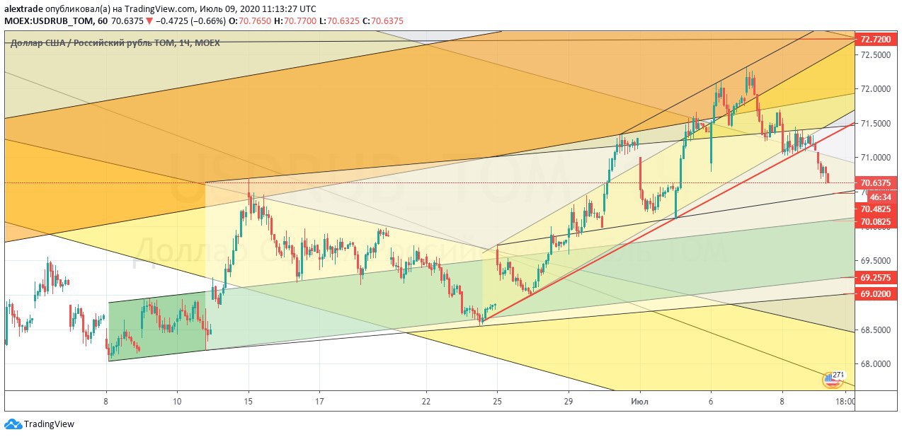мы потеряли локальный растущий канал. Падали до следующей поддержки 70,5, откуда прошел локальный отскок до 71,44 и это был удачный ретест снизу пробитой ранее поддержки (которая поднялась на тот момент времени, бывшая 71,2+). Что дальше? 70,5 поднялась до 70,6, если пробиваем ее падаем далее по даунканалу до 69,5.