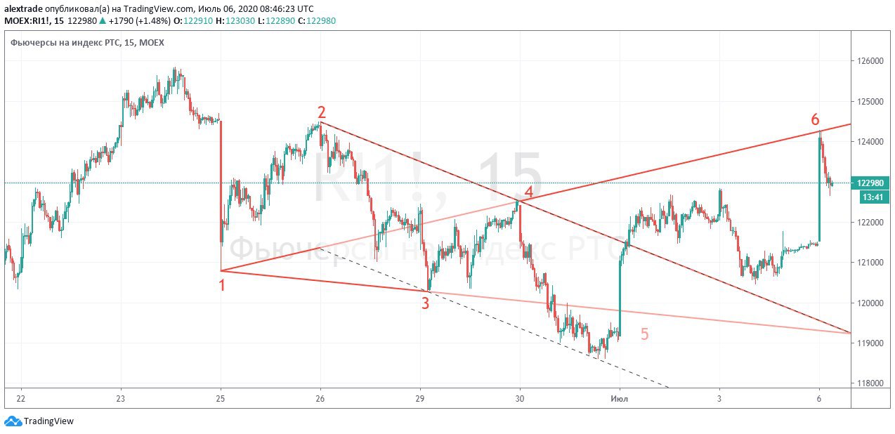 🇷🇺А так выглядит фьючерс РТС (Ри) утром, это 15-ти минутки, цель1- 6 выполнили по все той же Бычьей Волне Вульфа, здесь видно, что низ движения уложился в Sweet Zone (нижняя пунктирная линия) линия @pro_dengu РТС (Ри) @pro_dengu