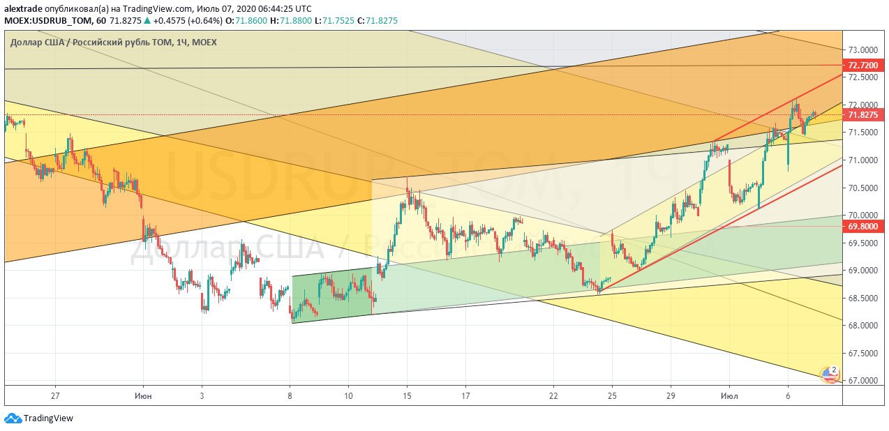 🇷🇺🇺🇸Рубль доллар, 71,82 закрытие 06 июля (+0,64%), прошли вверх 71,5+, зашли в старый апканал (оранжевый), показали максимум 72,10 далее пошел тест сверху 71,5+ (верней кластерной зоны 71,28-71,60 на тот момент времени) и он успешный, может еще один быть. Бросалась в глаза слабость рубля, на слабом DXY. Ожидания не меняются мои -72,7+ первая серьезная цель отскока, 72,3+ ,72,5 локальные сопротивления. @pro_dengu #рубль