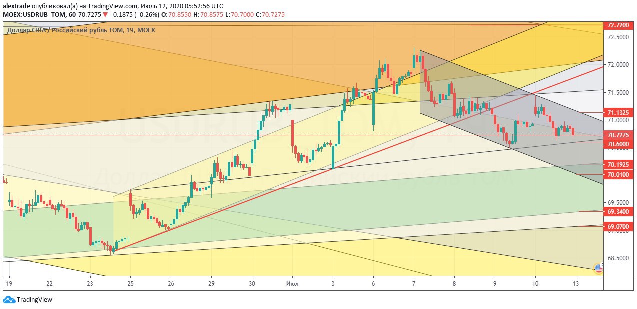 мы потеряли локальный растущий канал. Падали до следующей поддержки 70,5, откуда прошел локальный отскок до 71,44 и это был удачный ретест снизу пробитой ранее поддержки (которая поднялась на тот момент времени, бывшая 71,2+). Что дальше? 70,5 поднялась до 70,6, если пробиваем ее падаем далее по даунканалу до 69,5.
