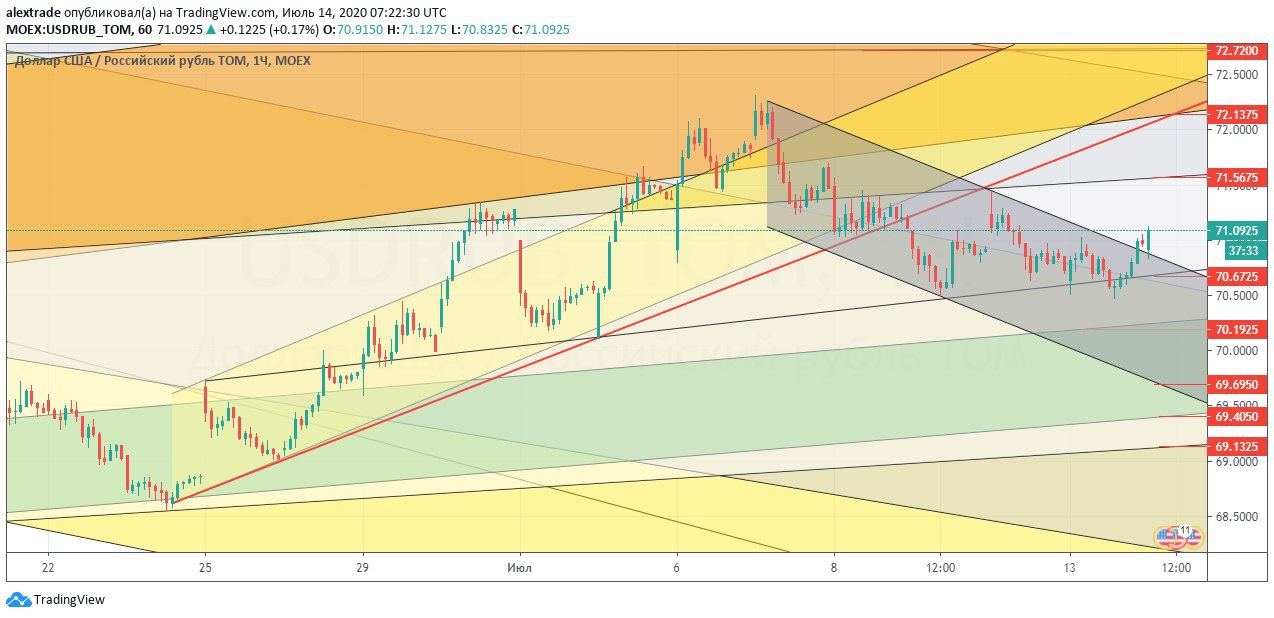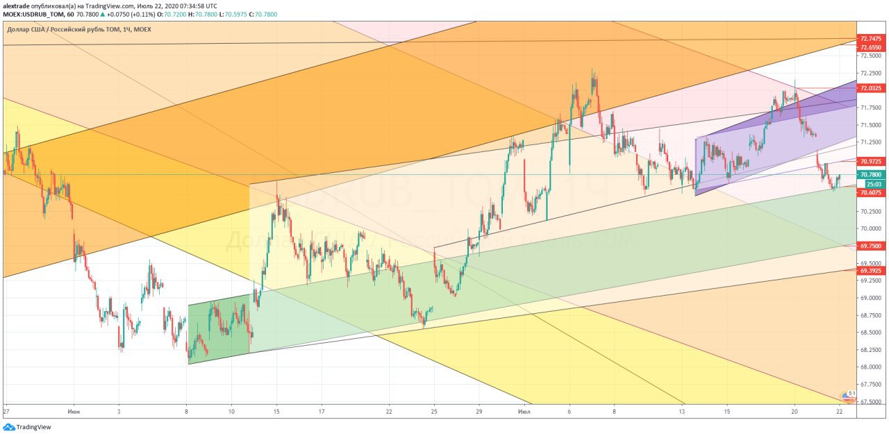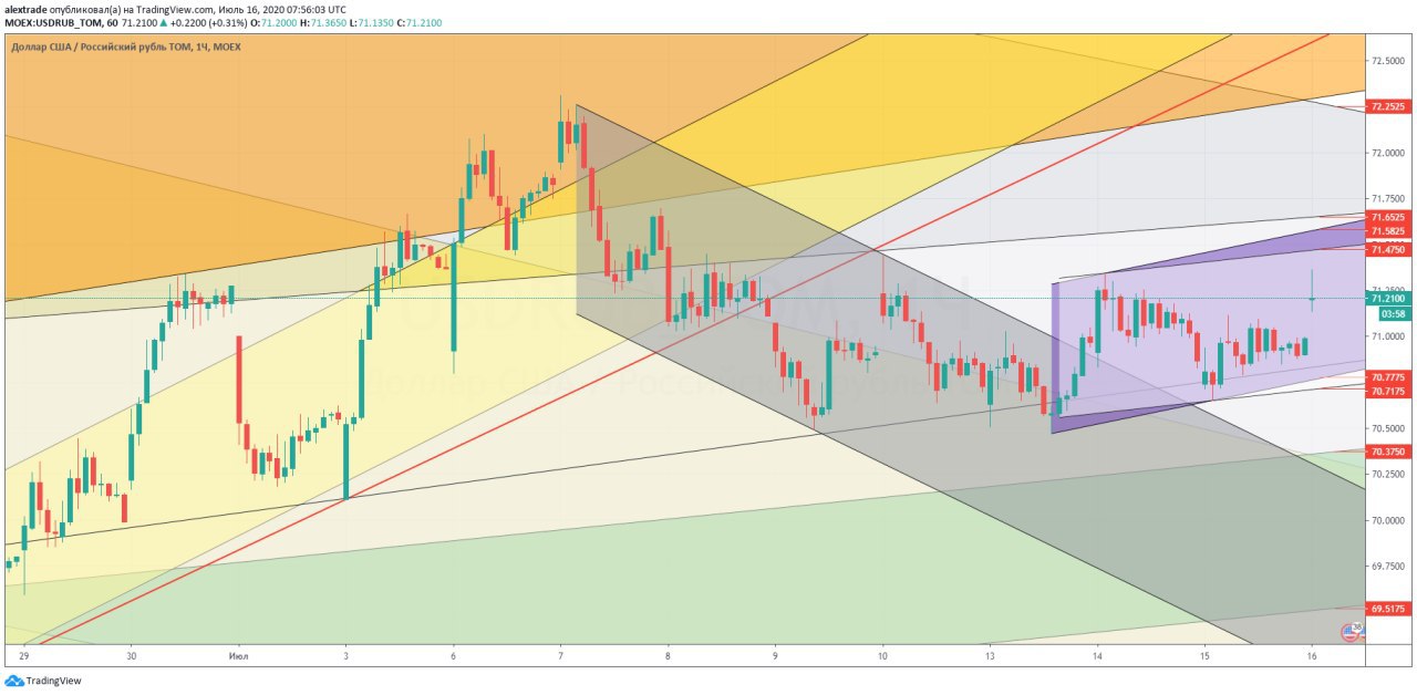 🇷🇺🇺🇸Доллар рубль, часовой таймфрейм, унылый боковик 71,21 в моменте, открылись сегодня с гепом вверх 71,47 сверху, 70,71-70,77. Долларовые медведи потеряли серый локальный даунканал 13 июля, это предполагало, по крайней мере, боковик, его и наблюдаем. Вывести из боковика может движение по нефти 45,2 совсем близко (идем до него пешком, верней ползем 😀), ничего не меняется жду сигнал на шорт нефти. Движение по DXY вверх тоже может качнуть эту пару, там пока рано на мелких фреймах. Лето, все ходит медленно, и этот год не исключение. @pro_dengu #рубль