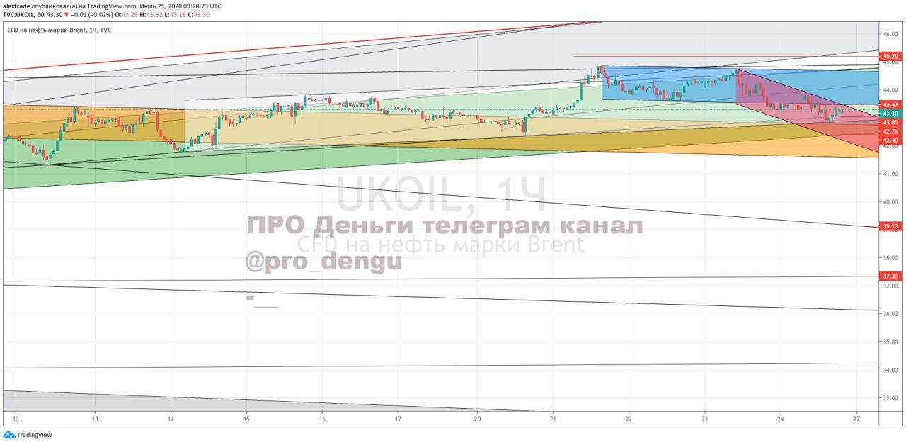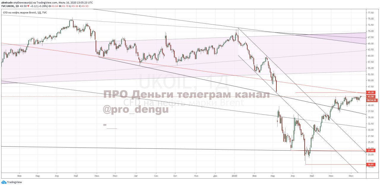 🛢Нефть брент дневной таймфрейм, 43,50 в моменте, пост немного раньше пишу, чем он выйдет на канале. Подрастаем медленно, впереди 44,8 (красная сигналка и 45,2 геп от 09 марта). Не достижение этих уровней и дает текущую ситуацию последних недель, быки слабо поднимают цену вверх, но пока откупают локальные проливы. Движение вверх от 16 долларов до текущих 43,5 идет по закруглению, это четко видно по графику. Лучший вариант для шорта- это пропуск цены до 44,8-45,2 и отложка под 42,4 (растет), или вариант без достижения 45,2, сразу пробой 41,3 (растет). Цели снижения 40,44 и 37,22 они динамические тоже, и далее вниз 32-34 (большая коррекция ко всему движению от 16 долларов). Жду, что это будет сделано в самое неудобное время (последние торговые часы пятницы, или неделю откроют сразу гепом вниз. Это будет сделано максимально цинично, такова природа торговли фьючерсной нефтью. А обоснование придумают и вынесут в новости (не в первый раз, и не в последний такое происходит). @pro_dengu #нефть