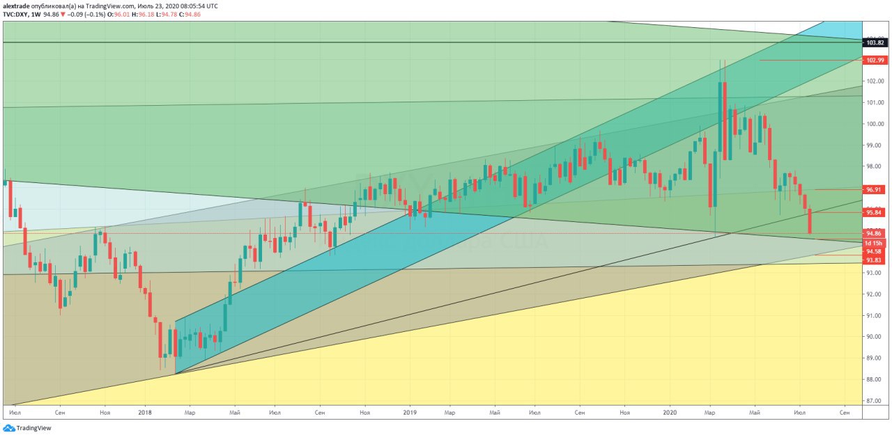 Именно этот тренд остановил снижение DXY от января 2017 года (103,82-89,02), дальше развивался растущий тренд от 2018 года,серый канал. Этот тренд пробит вниз. Далее идут четыре недельные "жуткие" свечи в диапазоне 94,65-102,99 (эти свечи показывают обвал на SP500). Дальше началось снижение DXY, которое проходит по текущий момент, ближайшая поддержка это сигналка от 2018 года 95,72 (ее текущее значение), от которой возможен отбой вверх.