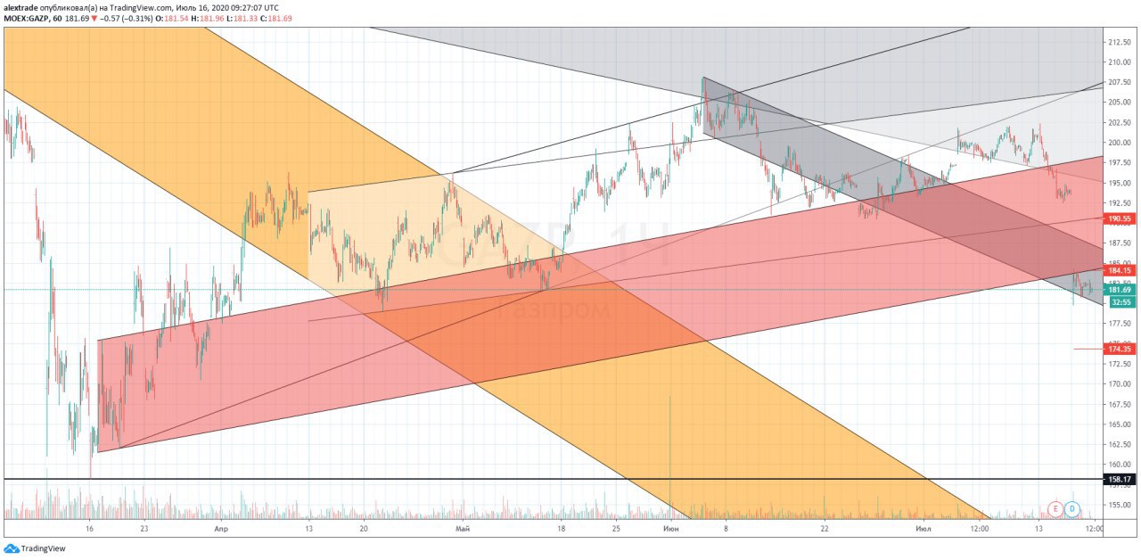 🇷🇺Газпром часовой таймфрейм, акция с 15 июля торгуется без дивидендов (15+ рублей), дивидендный геп хорошо заметен на графике. Мы выпали из локального канала роста (красного) от минимумов марта 2020 года 158+, ретест снизу канала один был, д. б еще (184+). Снизу 174,35 (эта поддержка с дневного тайминга) и 158+. Реализуется снижение акции, которое я описывал еще 5 июня на канале пост https://news.1rj.ru/str/pro_dengu/1898 @pro_dengu #Газпром