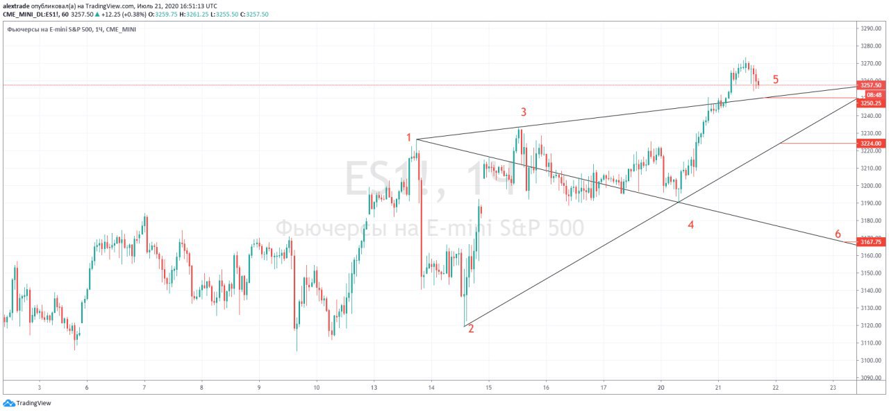 🇺🇸Фьючерс SP500 часовик, пришло время показать Медвежью Волну Вульфа, бычью показывал на SP500 здесь https://news.1rj.ru/str/pro_dengu/1962. Немного рано пишу о ней, мы сейчас в Sweet Zone над 3250, сначала надо зайти внутрь треугольника, но активация шорта под линией 2-4 (3224 сейчас, растет). Играется 1-6 цель 3167 (на 3177 помните я писал, что мы забыли сделать тест сверху, почему бы не сделать его в ближайшие часы или завтра?) @pro_dengu