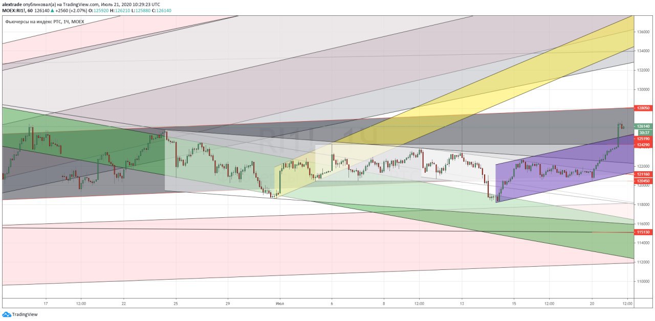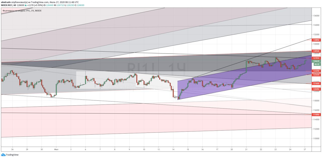 🇷🇺Фьючерс на индекс РТС (Ри) часовик, следуя за подрастающими SP500 и нефтью Ри вырос до 126 000+. Мы в сером канале, он почти боковой с небольшим наклоном вверх (121 200-128 050 сейчас его границы). Локальный апканал (фиолетовый), из которого мы сегодня вышли вверх без ретеста сверху, 125 200 примерно его верхняя граница сейчас. Если хотим идти дальше на 128 000+, надо сделать ретест верхней границы фиолетового канала, иначе завалимся вниз, внутрь канала. Нефть сейчас вплотную подошла к 44,5-45,2 (в этой зоне будет знатная рубка между медведями и быками) @pro_dengu. #РТС