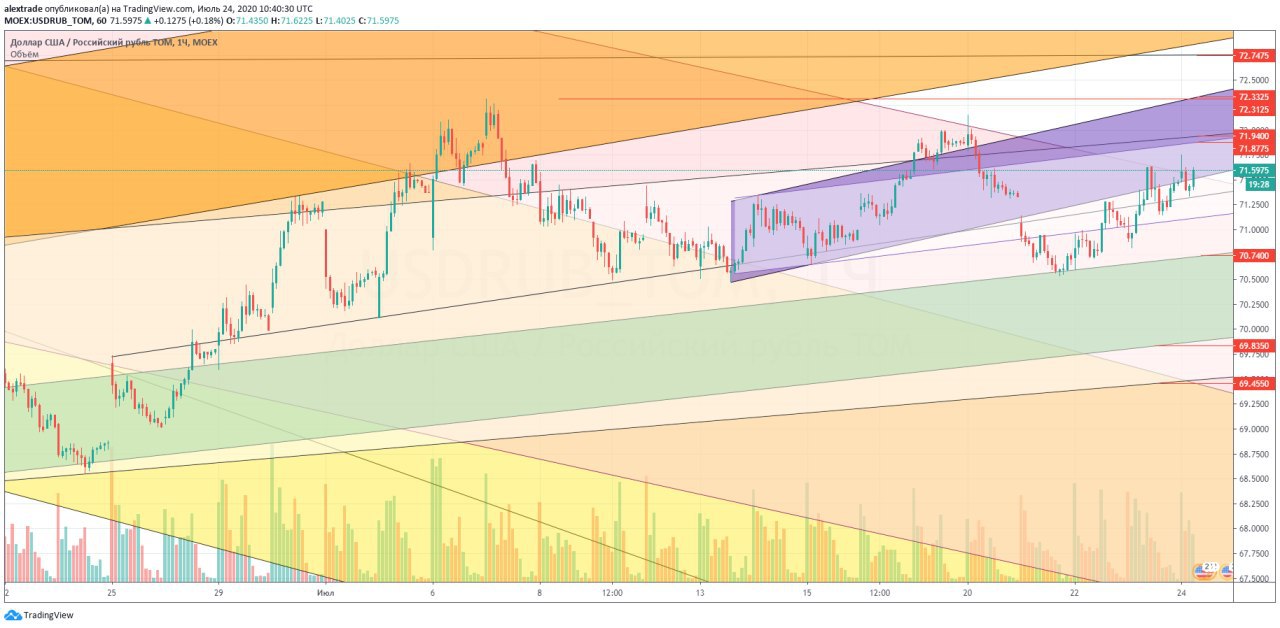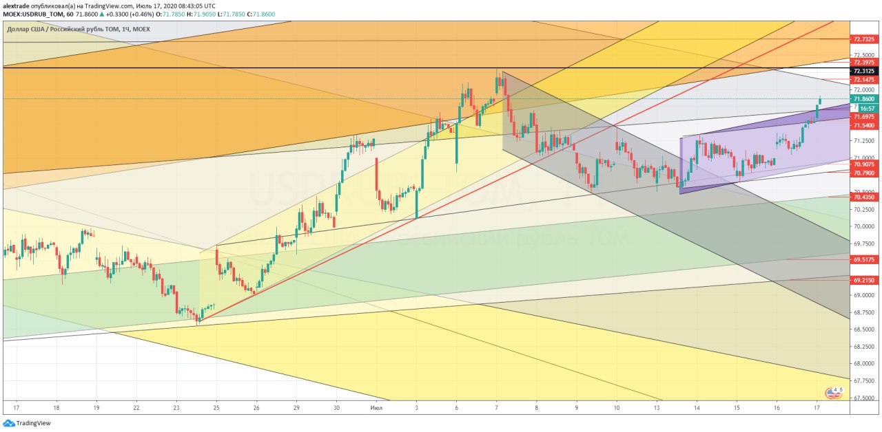 🇷🇺🇺🇸Рубль доллар, 71,86 в моменте, вышли из апканала (фиолетовый) вверх, но без ретеста сверху 71,70, успешно делаем ретест и тогда идем дальше вверх на фрактал 72,31 (за ним стопы медведей по доллару, и их выбьют) 72,14 локальное сопротивление, 72,40 и 72,7+ (выделю его жирным, оно основное). @pro_dengu #рубль