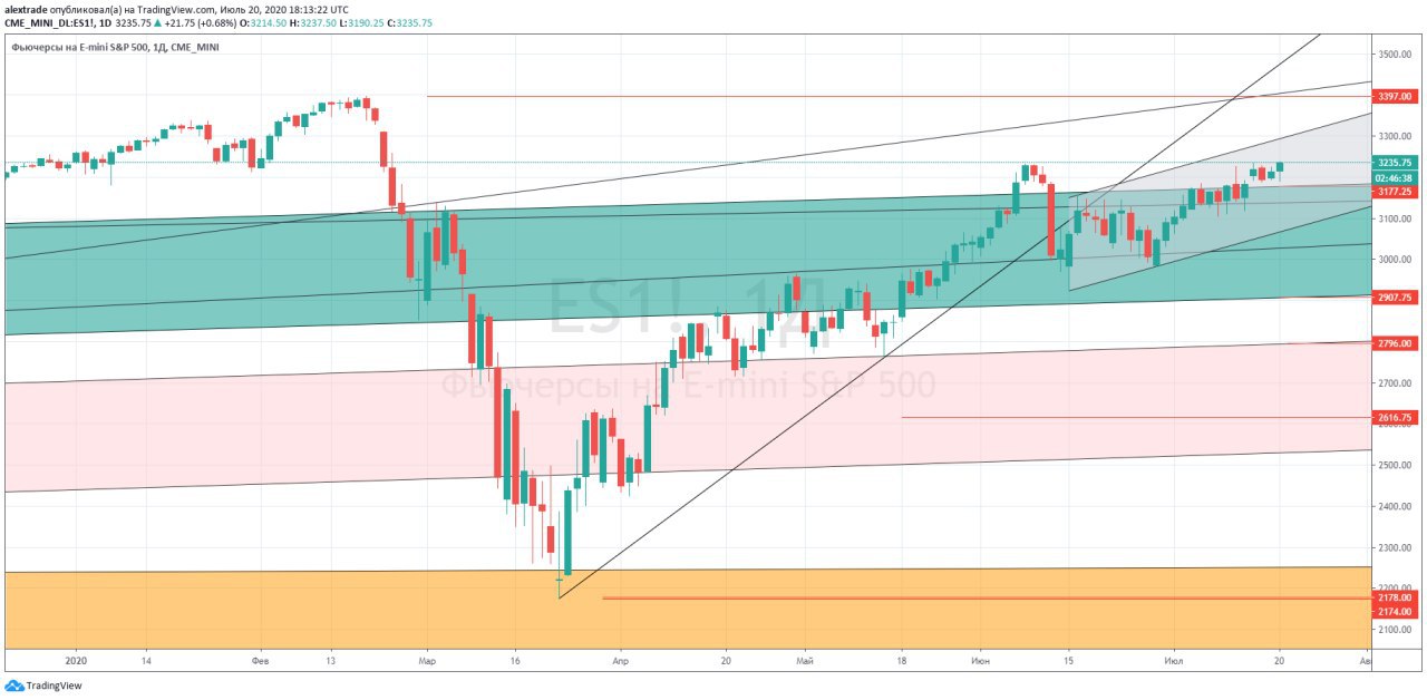 🇺🇸Фьючерс SP500 дневной, обновляем максимумы июня 2020 г. 3235 в моменте (+0,68%). Но ретеста сверху 3177 как не было так и нет, что делает рост неустойчивым.