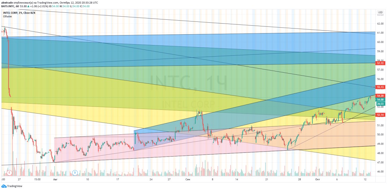 🇺🇸Акция Intel, что изменилось по отношению к обзору от 28 августа на видео? ссылка внизу . Растем, смогли пройти вверх 52 и 52,5 (52,5 без ретеста сверху, сейчас 52,14) и уперлись в 54,2 ( н.граница синего апканала), выше еще одно важное сопротивление 55,13. По факту не изменилось ничего, кроме того, что подросли 😃 (50,33 было на момент обзора на видео) глобальный тренд растущий, среднесрочный боковой, растем в рамкам широкого боковика. От сигналки 48,30 24 сентября (сейчас 48,75 очень четко пошел отбой вверх).