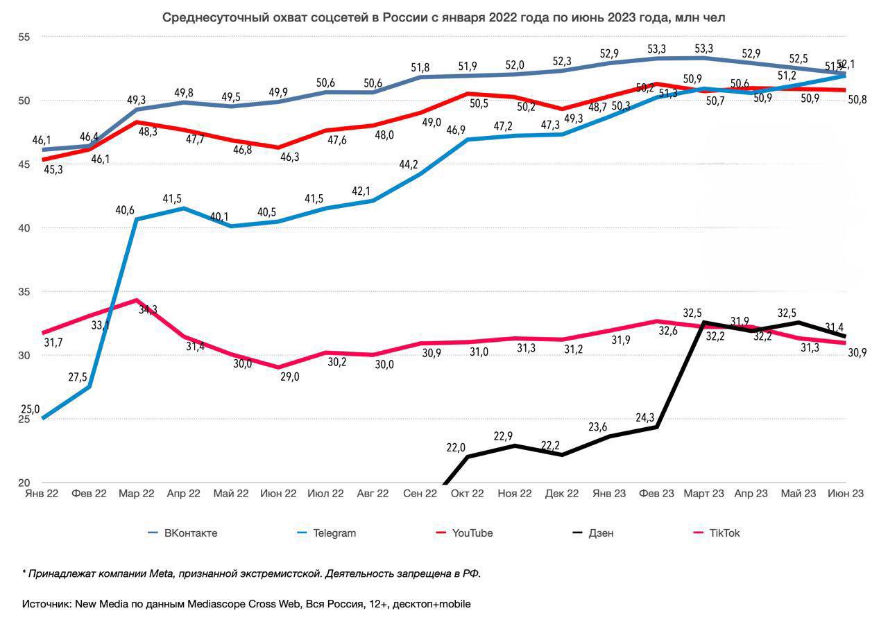 В июне Телеграм по российской аудитории сравнялся с ВКонтакте, опередив YouTube