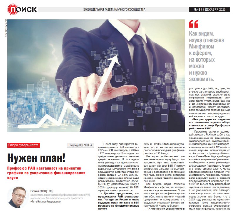 Профсоюз РАН требует разработать и утвердить график повышения бюджетных расходов на фундаментальную и гражданскую науку в процентах от объема ВВП: только это заставит Минфин выделять деньги на науку.