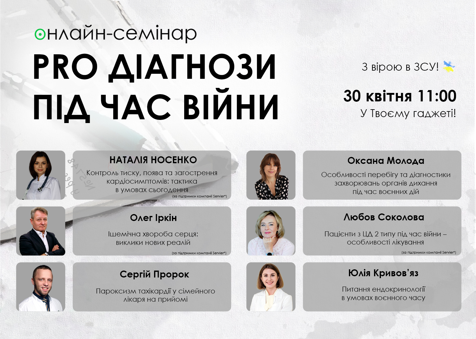 30 квітня запрошуємо вас на семінар «PRO діагнози під час війни», на якому з фаховими лікарями кардіологом Наталією Носенко, кардіохірургом-аритмологом Сергієм Пророком, фтизіопульмонологом Оксаною Молодою, ендокринологом Юлією Кривов’яз ми обговоримо загострення хронічних хвороб у нових реаліях, а також при недоступності необхідних ліків: