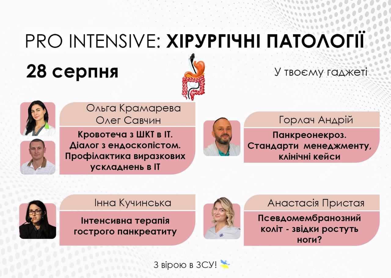 🗣Говоритимемо про менеджмент хірургічної патології в інтенсивній терапії. Обговоримо патогенез, клініку, діагностику, лікування пацієнтів із шлунково-кишковою кровотечею, гострим панкреатитом, панкреонекрозом, псевдомембранозним колітом.