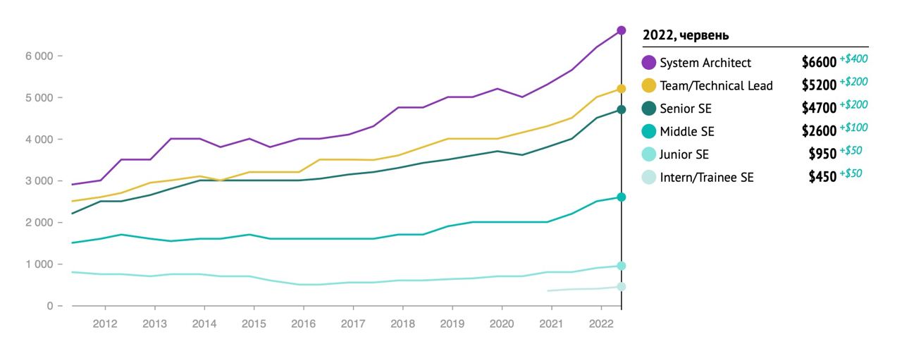 Попри початок повномасштабної війни, зарплати українських розробників у першому півріччі 2022 року зросли: медіана в червні становила $3400 проти $3300 в грудні 2021 року.