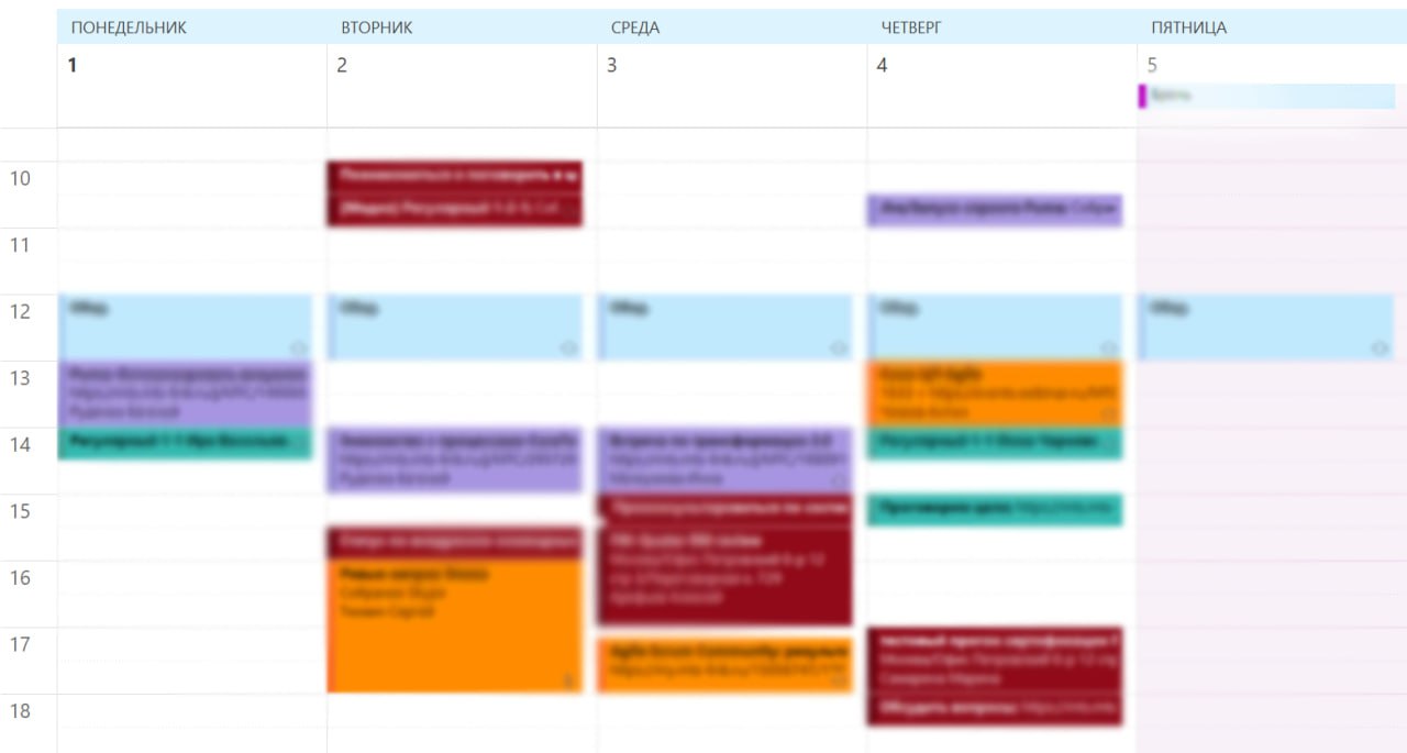 ⭐️ у меня создан ряд категорий (например: "встречи с C-level", "встречи с командами", "встречи 1-1 с подчинёнными", "планирования" и т.д). Один взгляд в начале рабочего дня на цвета позволяет понять на что ты будешь сфокусирован сегодня