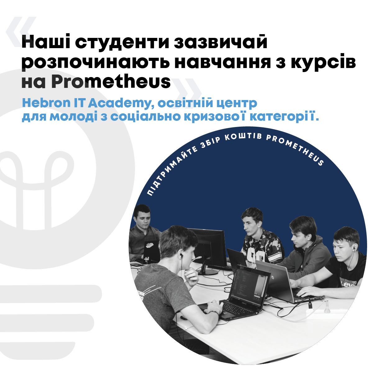 Курси Prometheus входять у дворічну програму навчання в Hebron IТ Academy, освітнього центру для молоді з кризової категорії, який безкоштовно надає своїм студентам якісну IT-освіту та допомагає працевлаштуватися! І це фантастично! 🚀