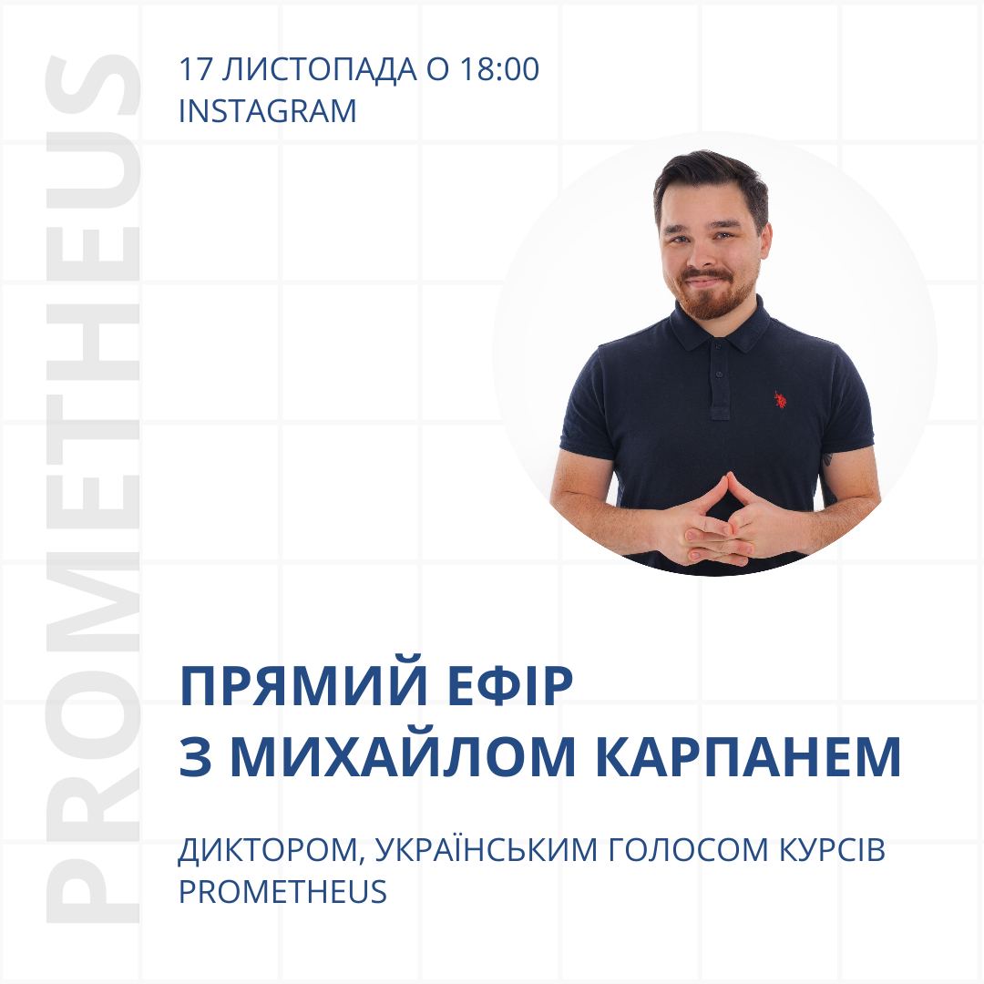 Вже завтра (17.11) о 18:00 проводимо прямий ефір з Михайлом Карпанем, диктором та голосом українського перекладу курсів Prometheus! Михайло також озвучував героїв серіалів «Дивні Дива», «Манадалорець, «Рік та Морті» та «Книгарня Блека».