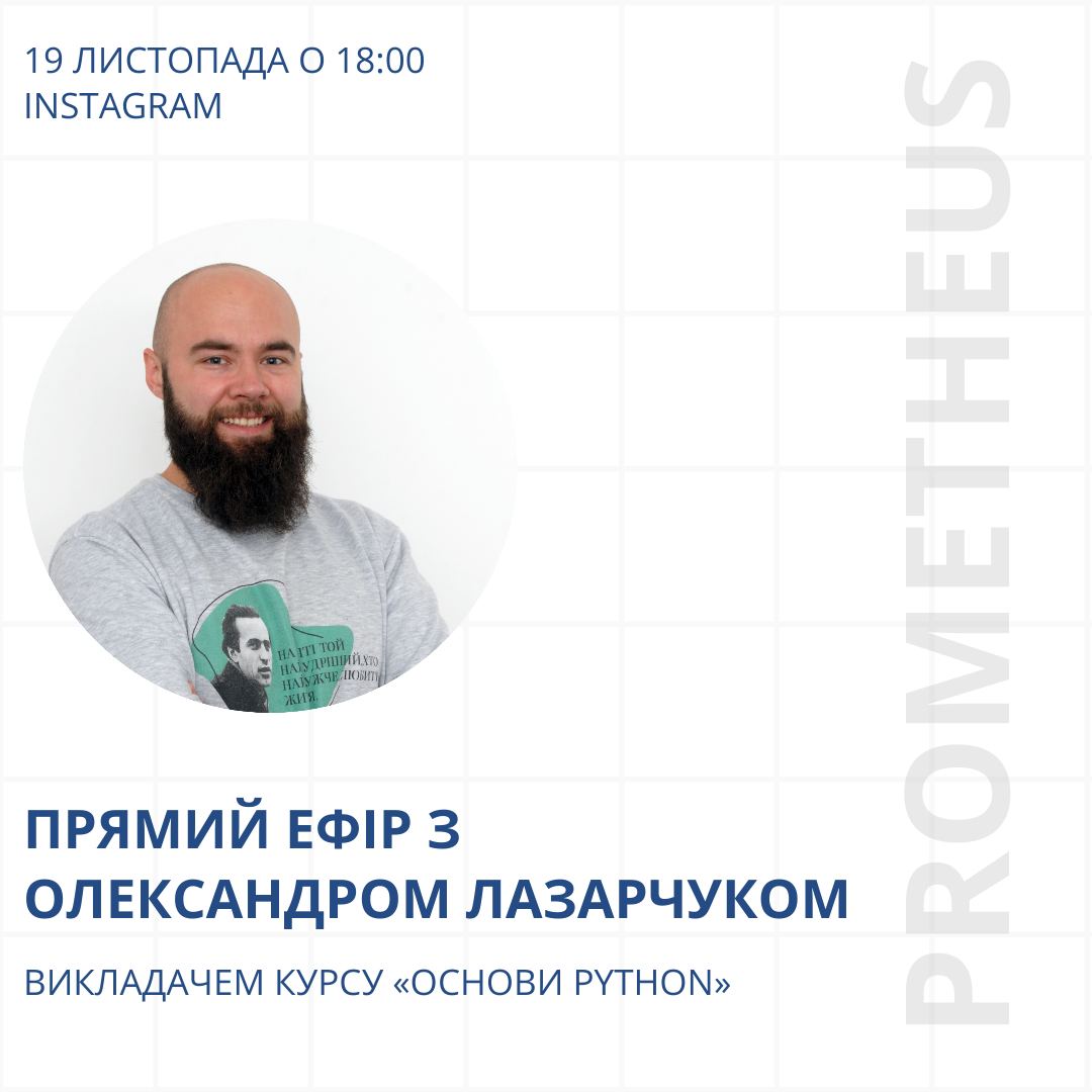 Вже завтра (19.11) о 18:00 проводимо прямий ефір з Олександром Лазарчуком, Python Technical Leader у компанії SoftServe та викладачем курсу «Основи Python»!
