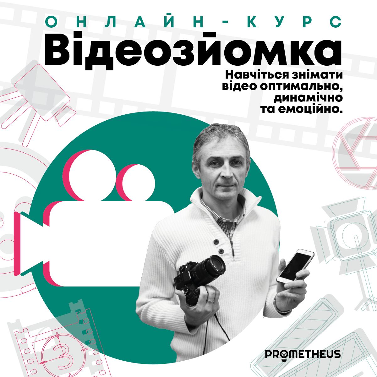 На курсі «Відеозйомка для кожного» ви навчитеся знімати якісні відео на будь-які гаджети — смартфон, фотоапарат чи на відеокамеру. Ви дізнаєтеся, у чому полягає секрет динамічних та емоційних відеороликів, та зможете використовувати це для створення власних сценаріїв. Опануєте техніку запису інтерв’ю, а також навчитесь знімати на відео себе.