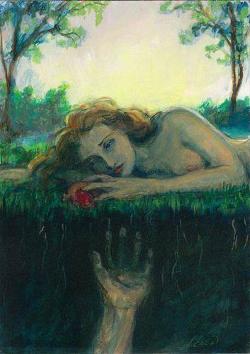 В мифологии, как мы уже видели, мы встречаем Персефону сначала как молодую женщину, очарованную цветами и близкую к своей матери, Деметре. Но затем она теряет свою невинность, когда Гадес, Бог Подземного мира, похищает её и делает своей невестой в тёмном месте, невидимом для обычных глаз. Как королева того места смерти, Персефона очень отличается от себя прежней, теперь она полна силы и, в некоторых историях, обладает более глубокой красотой. Она состоит в браке с самыми глубинными и тёмными сторонами души, зачастую смущающими, иногда болезненными и всегда таинственными.