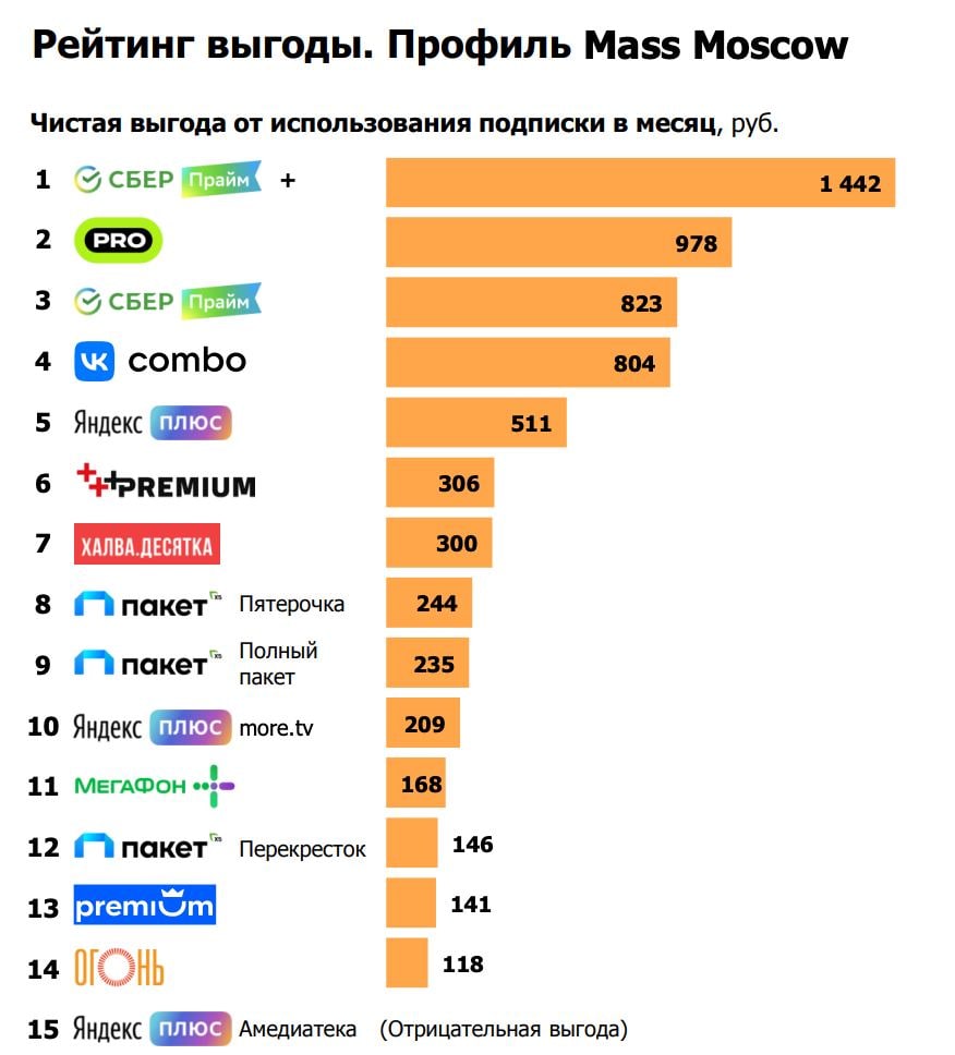 Аналитики посчитали, что по чистой выгоде для клиентов (как в Москве, так и в регионах) в лидерах продукты Сбера, Tinkoff Pro и VK. Неожиданно слабо выступил Яндекс, заняв лишь пятое место. Чистая выгода для клиентов Сбера и Тинькофф может достигать 1,4к рублей, а для продвинутых пользователей — больше 3к.