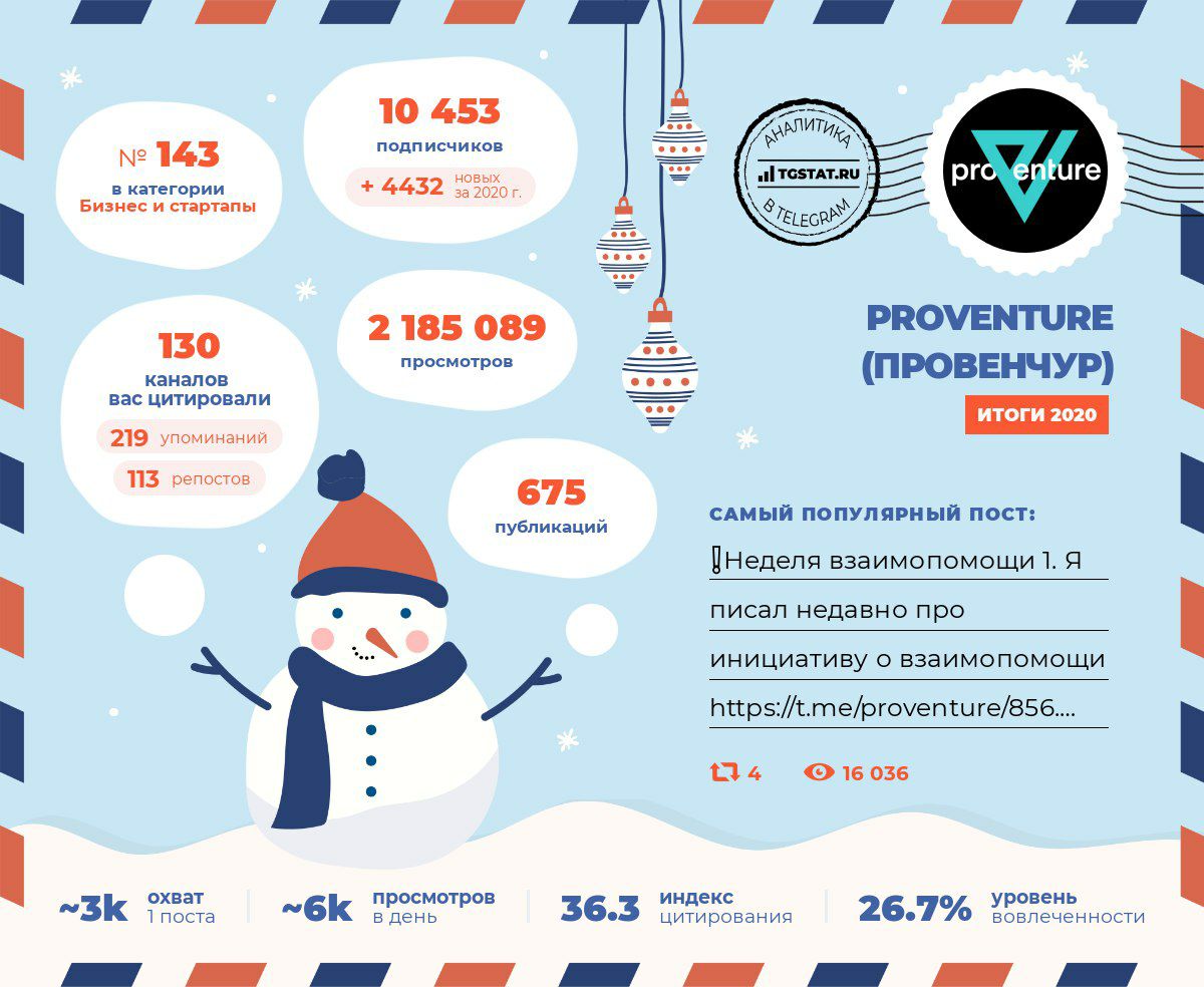 В качестве небольшой ложки дегтя все же поделюсь новогодней статистикой от tgstat по @proventure. 2 млн просмотров это сильно! Спасибо вам!