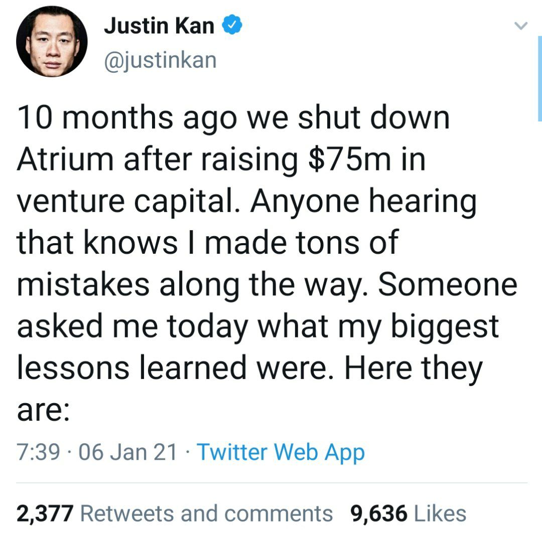 Огненный и откровенный трэд от Джастина Кана, со-основателя Twitch и серийного предпринимателя, который поднял $75 млн в свой новый legal-tech стартап от топовых VC во главе с a16z, но 10 месяцев назад закрыл его и уволил 100 человек.