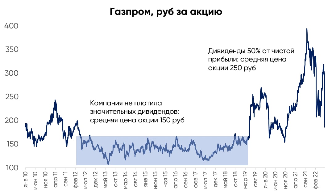 ⛽️ Если вспомнить период с 2012 по 2019 год, когда Газпром не платил значимых дивидендов, его котировки колебались в узком диапазоне и в среднем составляли 150 руб. за акцию. С переходом на выплату 50% от чистой прибыли его акции поднялись до 400 рублей, а в среднем торговались по 250 рублей. Мы ожидаем, что Газпром вернётся к выплате 50% от чистой прибыли и его котировки значительно вырастут.