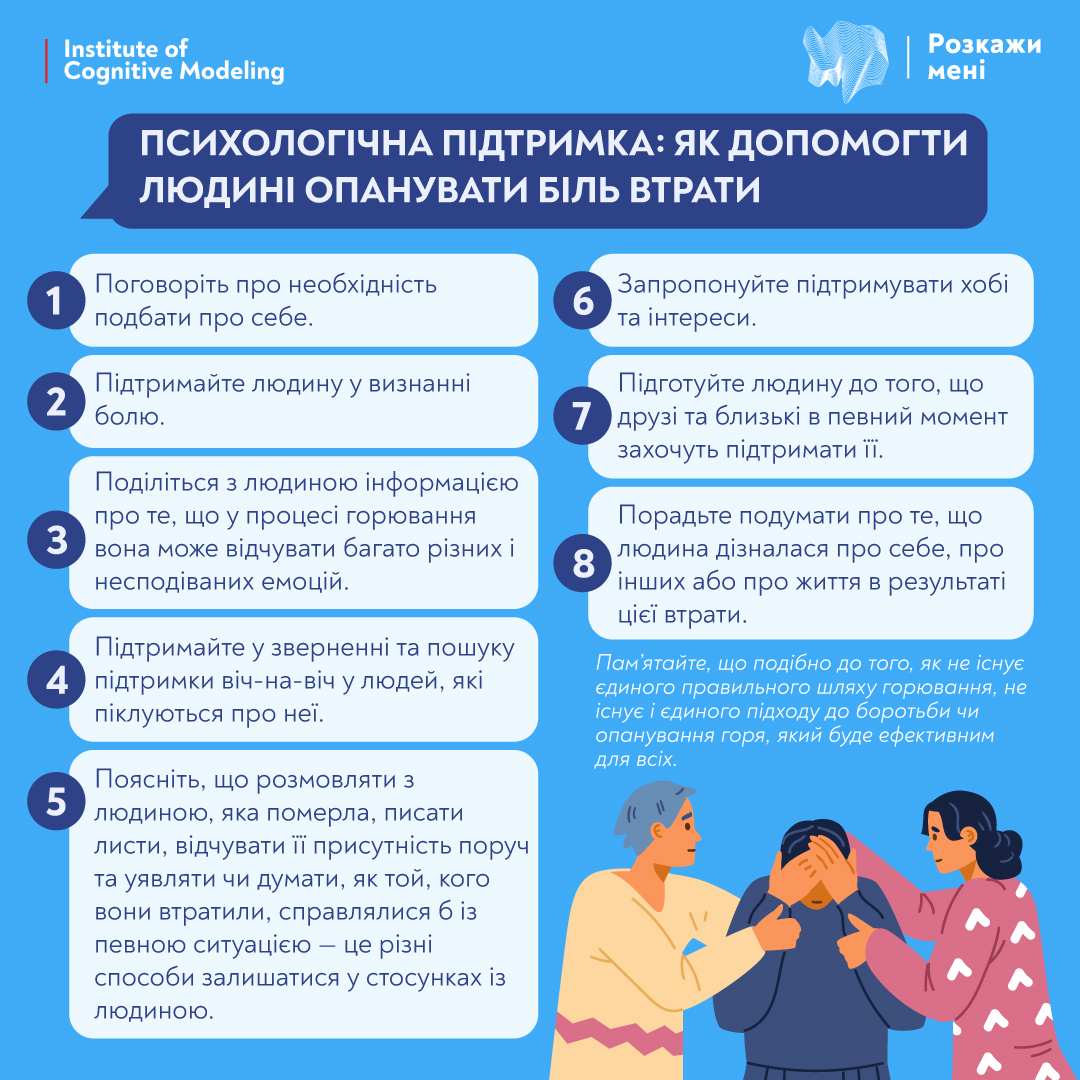 💬Пам’ятайте, що людям зазвичай не хочеться говорити про свої переживання й думки, тому часом кращою допомогою може бути варіант просто знаходитися поруч з іншими, які також любили людину, що померла.