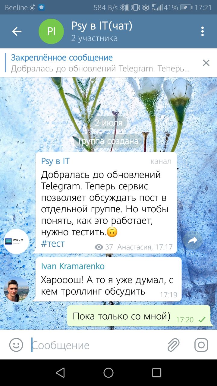 Добралась до обновлений Telegram. Теперь сервис позволяет обсуждать пост в отдельной группе. Но чтобы понять, как это работает, нужно тестить.🙃